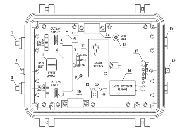 Performance characteristics • Adopt US E-O high-performance optical receiver module, field water-repellent shell. • Adopt Philips low-noise microwave tube pre-amplifier circuit and power doubler (or push-pull) output module. • Built-in continuous adjustable equalizer and attenuator, plug-pull output brancher component, 8-class optical power display. • Strict anti-thunder system, and high-reliability switch power. • Suitable for middle or small CATV network. |