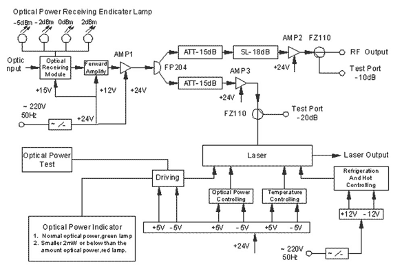 Adopt high linear, optical isolation, distribution feedback and hot electricity refrigeration of EO, ORTEL and Lucent world famous band laser. Used in offering the good quality of the picture, digital and compress signal transmission. Built-in RF driving amplifier and controlling circuit, guarantee the index of noise and adjust. Adopt big Aluminium housing, the complete high-reliable optical power output stability circuit and laser hot electricity refrigeration temperature stable controlling circuit. Set-in the high-reliable switch power, can be working properly in the range of 85~254V. |